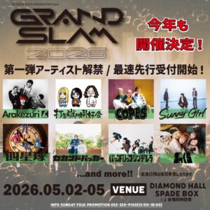 GRAND SLAM 2026 5月 3 Sun 2026 (問)サンデーフォーク OPEN 13:15 / START 14:00 入場時ドリンク代 600円別途必要 お問い合わせ:サンデーフォークプロモーション 前のスケジュール 次のスケジュール